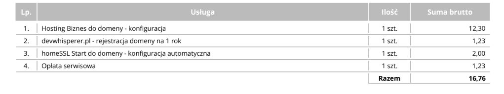 Serio, siedzę w branży IT od lat, ale czasami zachowuję się jakbym pierwszy raz zajrzała do internetu. Swojego bloga Devwhisperer.pl postawiłam w lipcu 2024 na usługach Home.pl. Skusili mnie mnie niską ceną za domenę (SSL w pakiecie) i klawą opcją hostingu. Zapłaciłam za te opcje - uwaga - 16,76 PLN za rok. Mówię o PLN-ach, a nie jakichś tam dolarach czy hinduskich kopiejkach. Screen z FV: