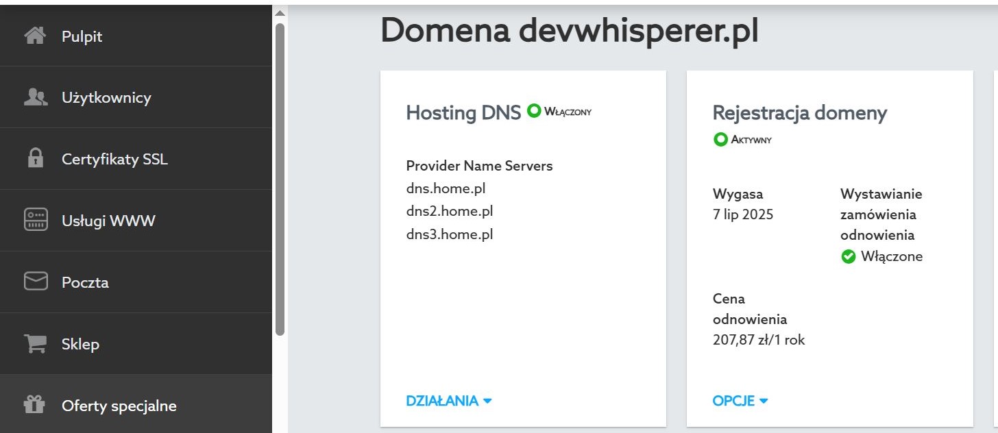 - 207,87 PLN za przedłużenie ważności domeny Devwhisperer.pl