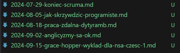 Ostatnią rzeczą, którą zrobiłam były nazwy postów. Jekyll wymusza nazwenictwo plików .md postów, które składają się z daty w formacie YYYY-MM-DD oraz nazwy, pod którą strona będzie dostępną jako URL. Na przykład post na temat wykładu Grace Hopper zmigrowałam jako plik: 2024-09-15-Grace-Hopper-Wykład-Dla-NSA-Część-1.md. Wygenerował on następujący URL: https://devwhisperer.pl/Grace-Hopper-Wykład-Dla-NSA-Część-1/. Źle to wyglądało i oczywiście nie działało, bo przecież większość web serwerów jest case-sensitive, o polskich znakach już nie wspominając. Linki, które wrzucałam przez ostatni rok na profile na Facebooku i Linkedinie z tego powodu też przestły działać. Rozwiązaniem było doprowadzenie nazw plików do postaci, które generowały URL-e takie same jak Wordpress, czyli www.devwhisperer.pl/tytul-posta-bez-polskich-znakow. Coś takiego: