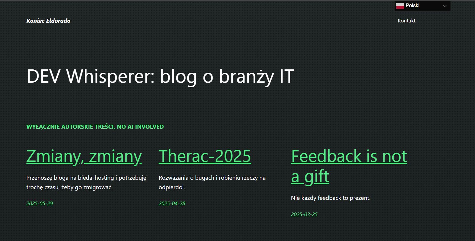 W ramach hostingu Home.pl korzystałam z opcji reklamowanej jako “dla biznesu”, z serwerem pocztowym, bazami MySQL i PostreSQL oraz serwerem www, na którym zainstalowałam Wordpressa. Zainstalowałam to chyba zbyt monce słowo, bo to był klasyczny ClickOps. Skorzystałam z plugina Wordpress, założyłam na nim konto i podpięłam domenę Devwhisperer w panelu administracyjnym Home.pl. Tym samym nie musiałam się w ogóle pierdolić z konfiguracją CMS-a i bazy danych. W zasadzie w tym mało wyrafinowanym procesie moja rola sprowadzała się tylko do wybrania templatki do bloga i kosmetycznych zmian w stylu strony. Wszystko odbyło się prosto, łatwo i przyjemnie, a także - jak się miało okazać po roku - w opór DROGO, ale wtedy o tym nie myślałam.