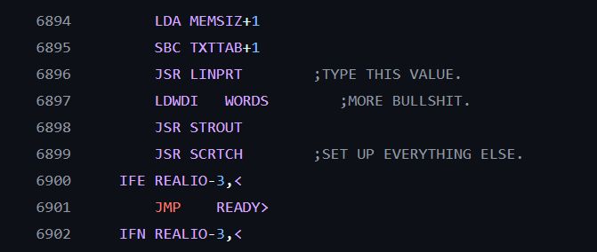 Albo inny przykład. Niedawno Microsoft wypuścił na GitHubie kod źródłowy dla BASIC 6502. Dla przypomnienia: był to napisany w asemblerze interpreter tego języka dla mikroprocesorów 8-bitowych takich jak MOS 6502. Chodziły na nich takie ikony informatycznej popkultury jak Apple II, Entertainment System (NES) czy Commodore 64. Kawał historii w jednym pliku! Dziwi mnie trochę, że nikt nie zwrócił uwagi na czyste złoto w postaci komentarzy do kodu BASIC 6502. Poniżej moje ulubione cytaty od autorów kodu - samego Billa Gatesa i Rica Weilanda 🙃.